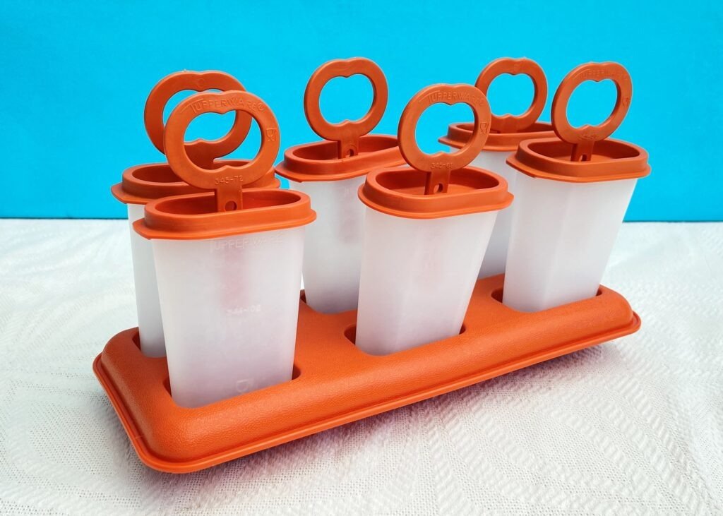 Plastic played a major role in the modern kitchen. Tupperware, already well established by the 1960s, became increasingly popular in Britain through hostess parties. The range included storage containers as well as egg cups, cheese graters, ice-lolly moulds and juicers. Pastel colours remained popular, with brighter oranges and yellows appearing later in the decade. Melamine was widely used for trays and chopping boards because it was durable and easy to clean. Other plastics appeared in mixing bowls, utensils, bread bins and cleaning equipment.