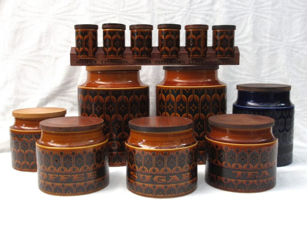 Matching storage jars were another essential feature. It was fashionable to keep them on display, usually arranged by size and labelled tea, coffee, sugar and biscuits or flour. Some had wooden lids while others used ceramic lids with rubber seals. Hornsea was one of the major makers of these sets, alongside companies such as Crown Devon and Taunton Vale. Matching accessories such as sugar shakers were also available.
