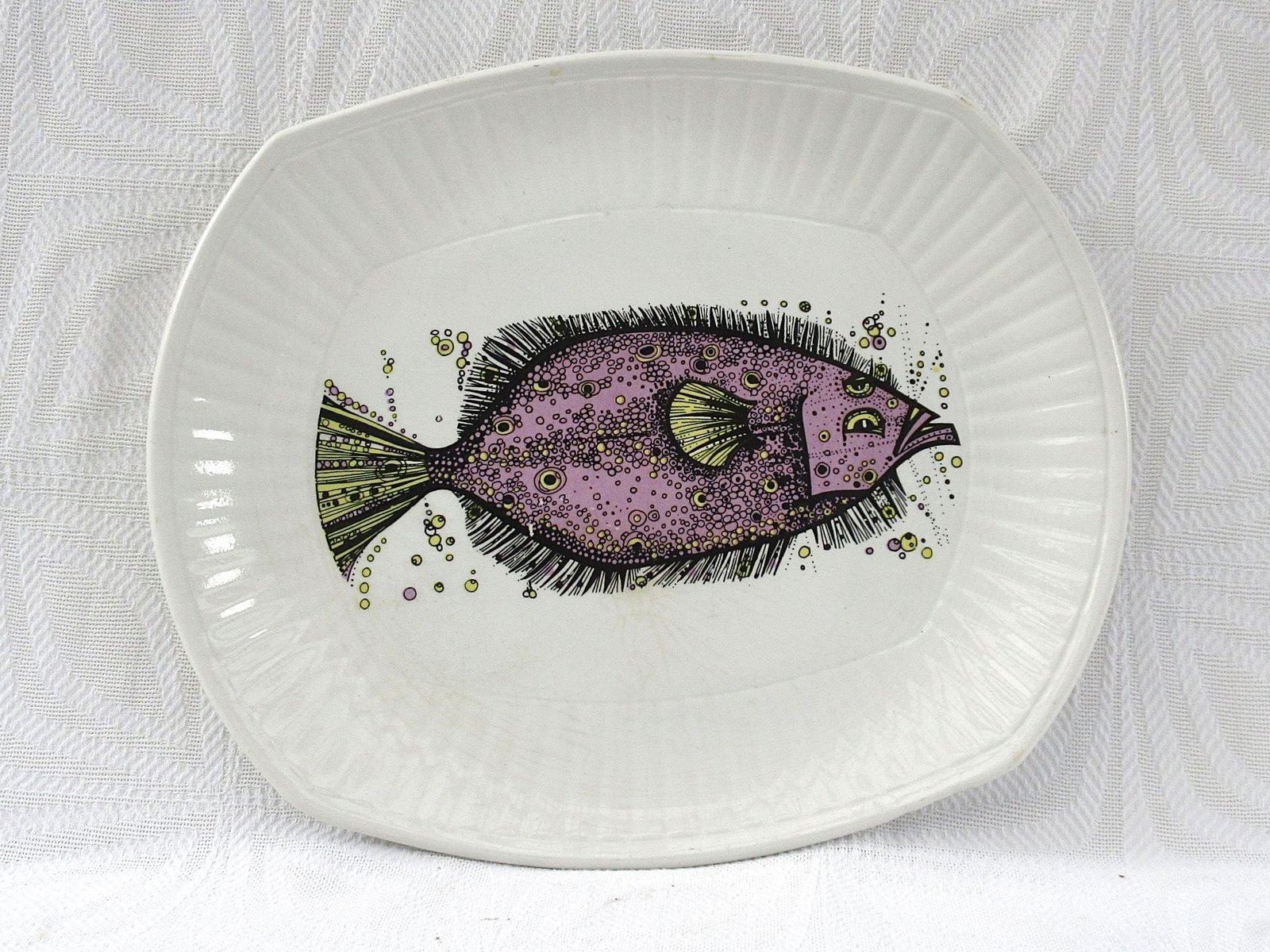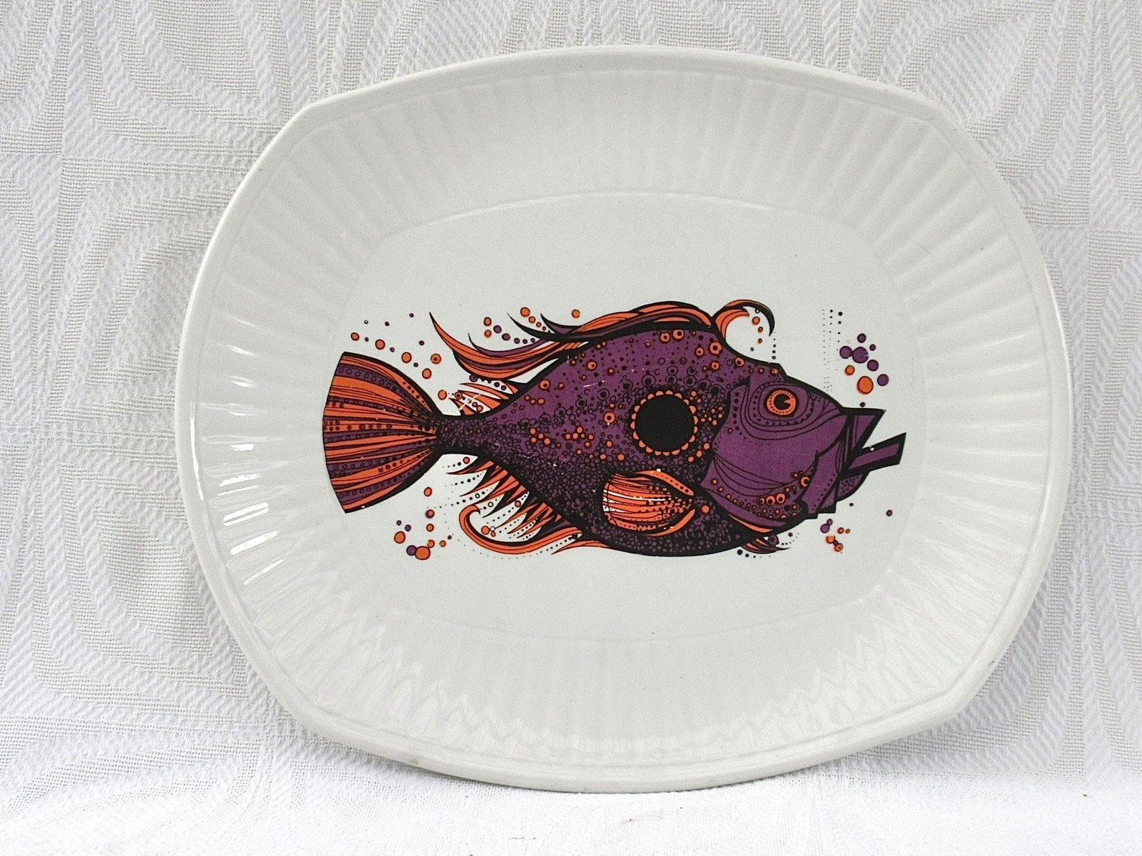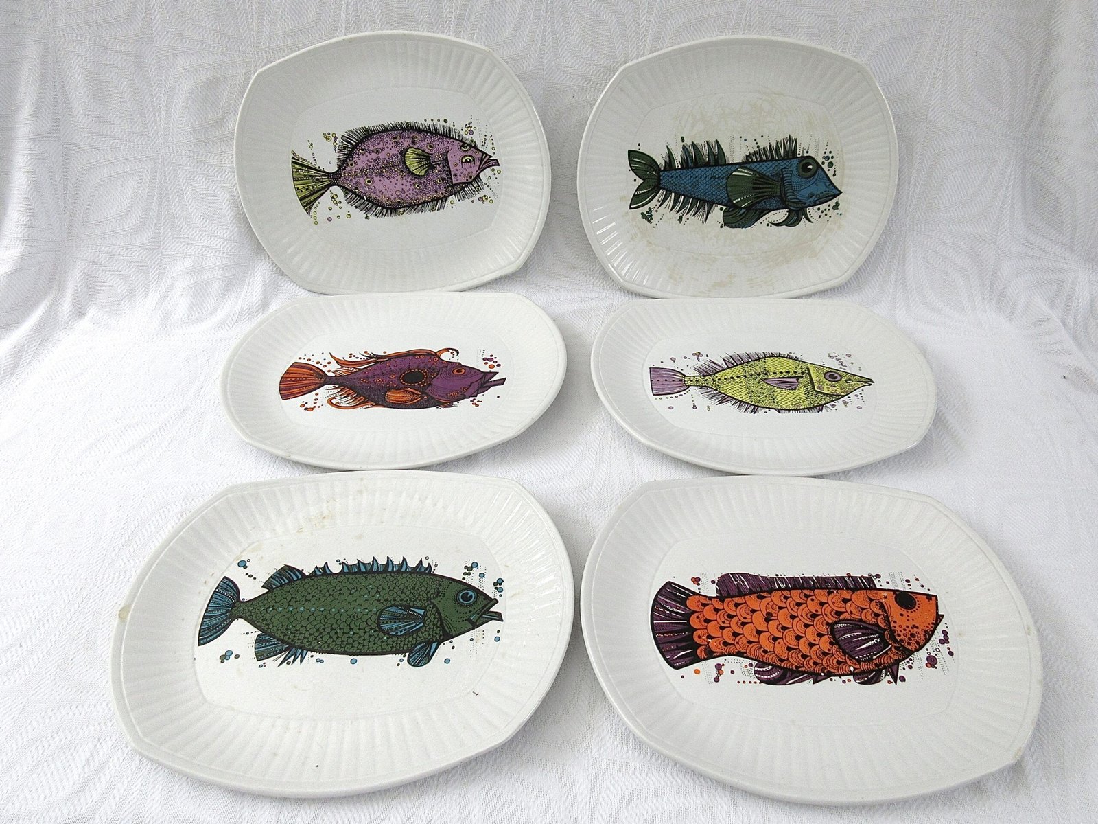 Vintage Aquarius Fish Plates Psychedelic Colours Late 60s – Choose Plate. These are very popular and sought after! And no wonder, as the designs are fab. Made by the same people who created the Beefeater plates with bulls and cows on. But this time its fish!