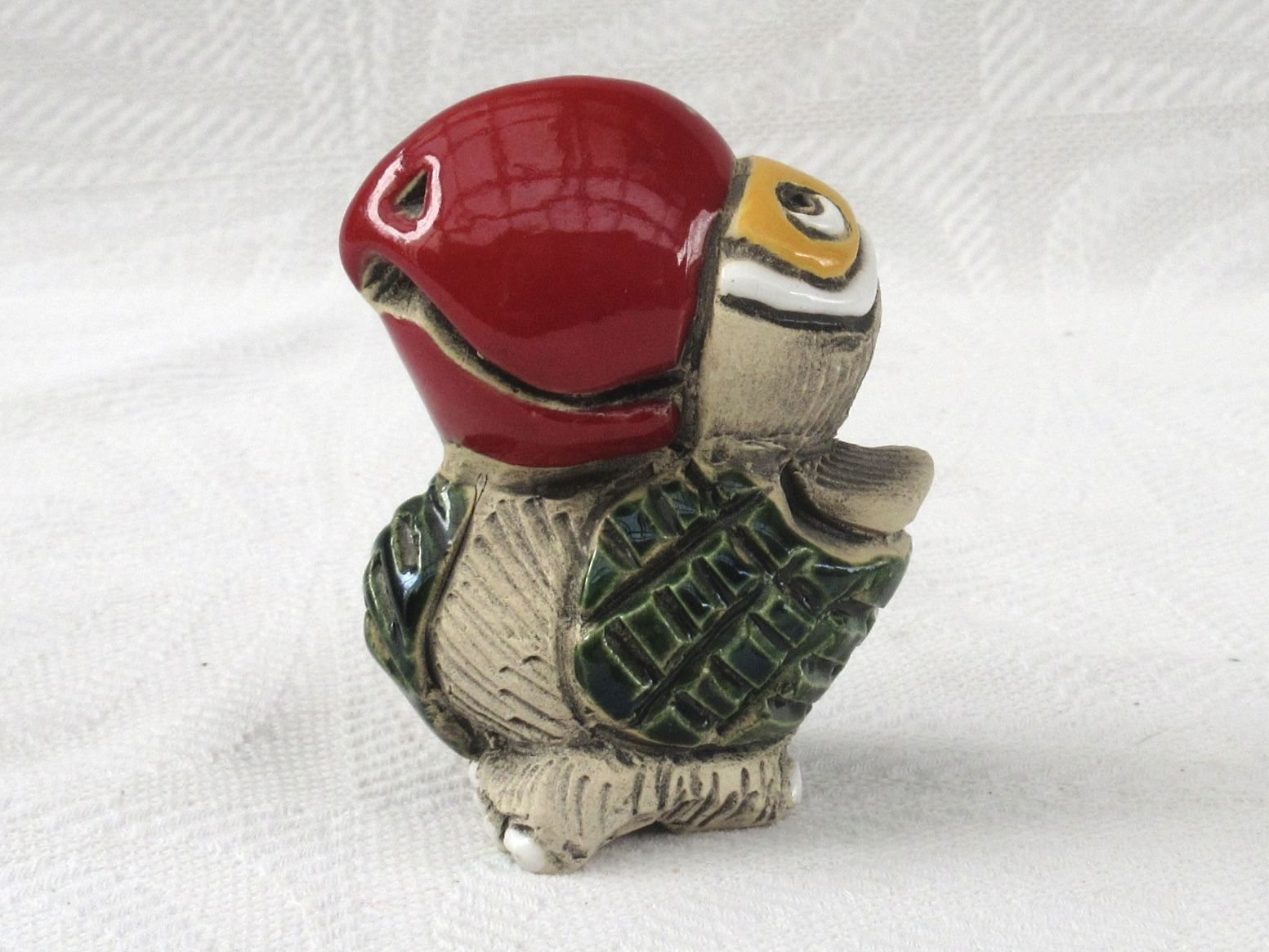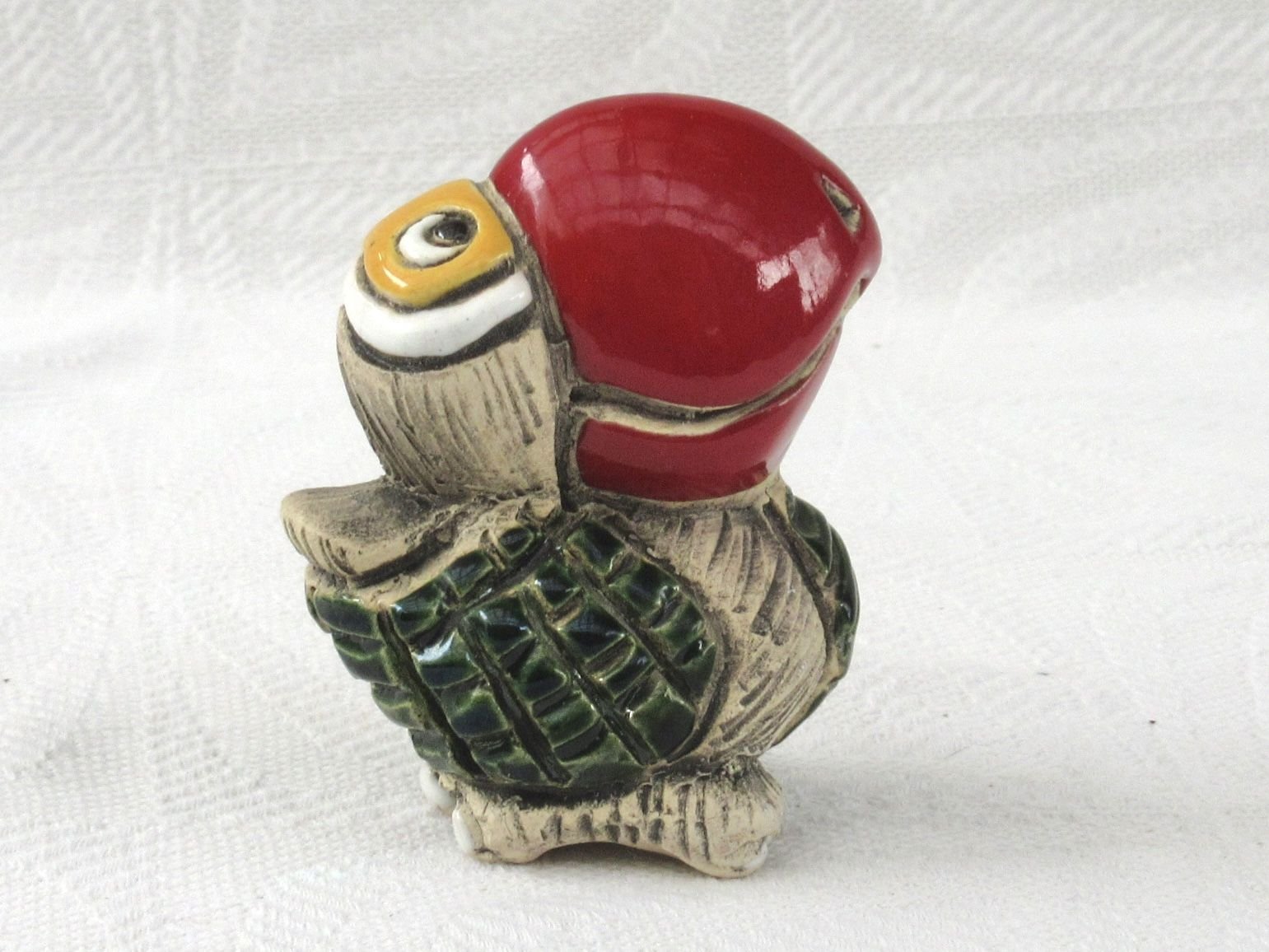 Vintage Artesania Rinconada Papagayo Hand Carved Parrot Uruguay. These collectible figures were produced by artists like Jesús and Javier in the 1970s, known for their unique, hand-painted details and rustic clay texture