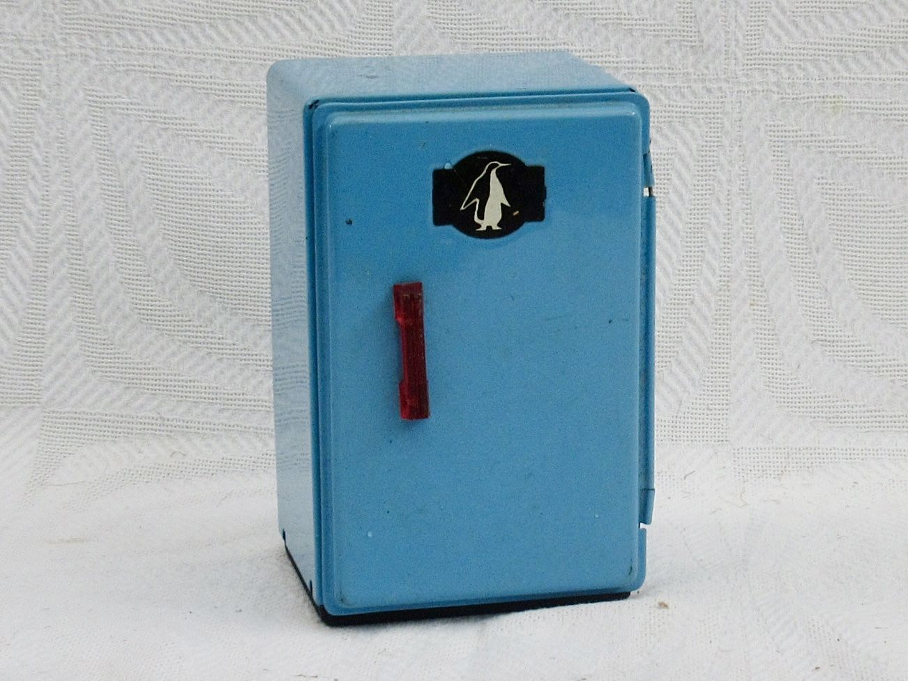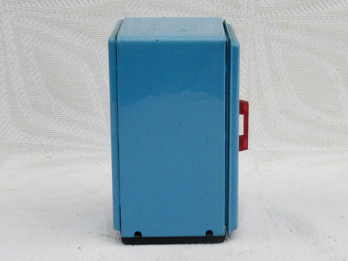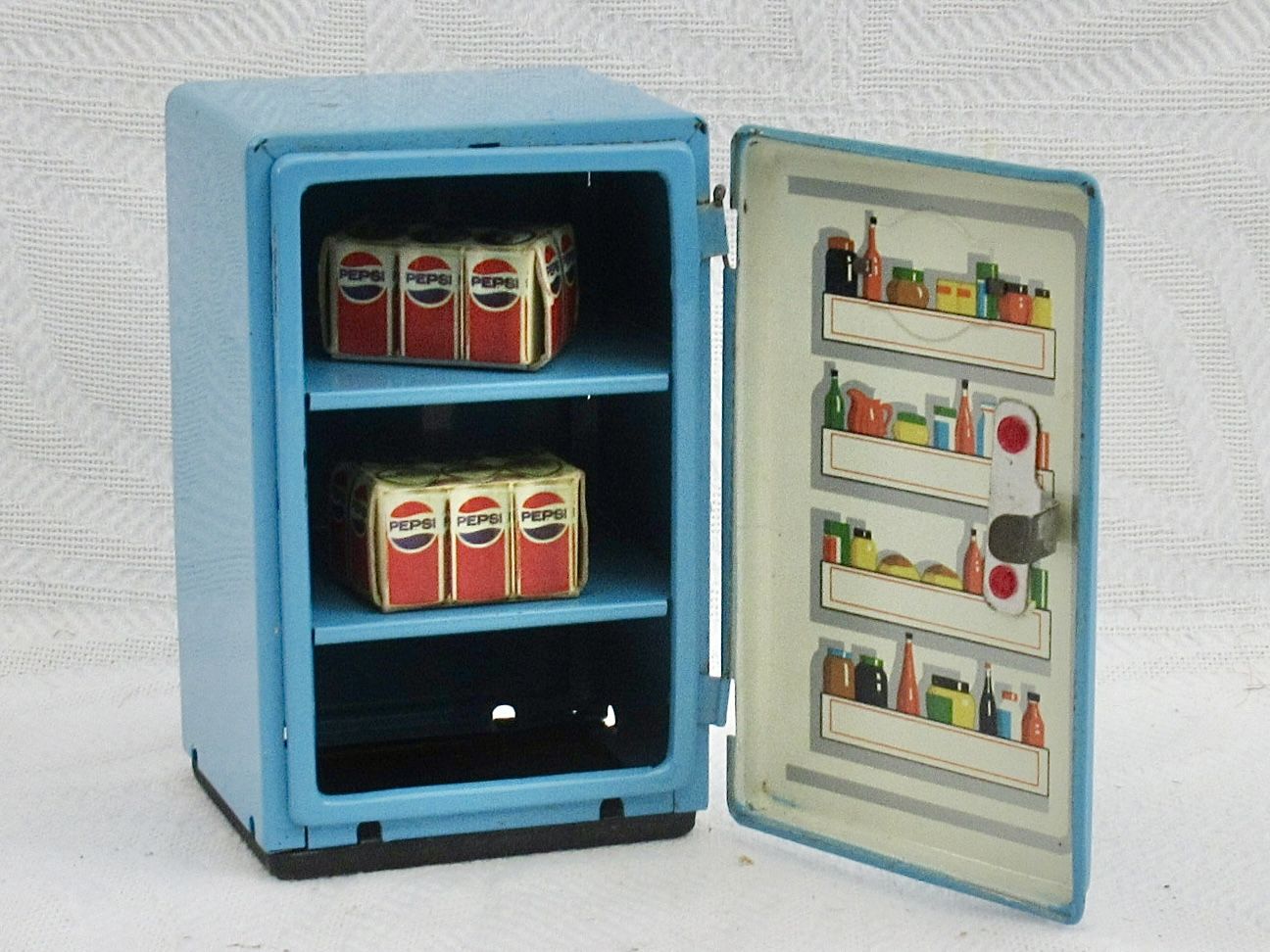 Vintage Blue Metal Fridge Toy Dolls Pretend Play with cardboard faux Pepsi Cans 60s 70s