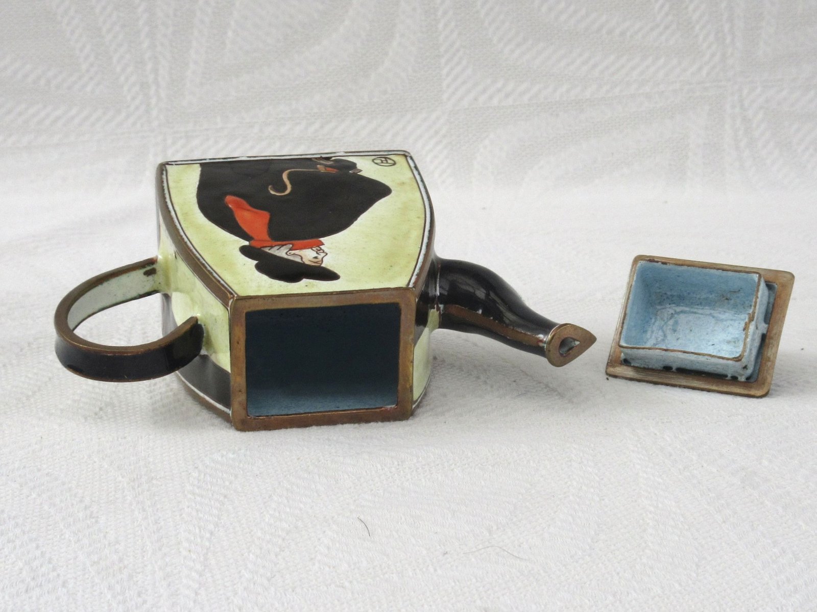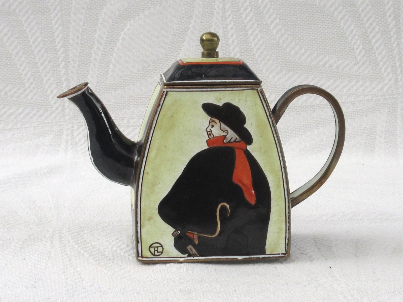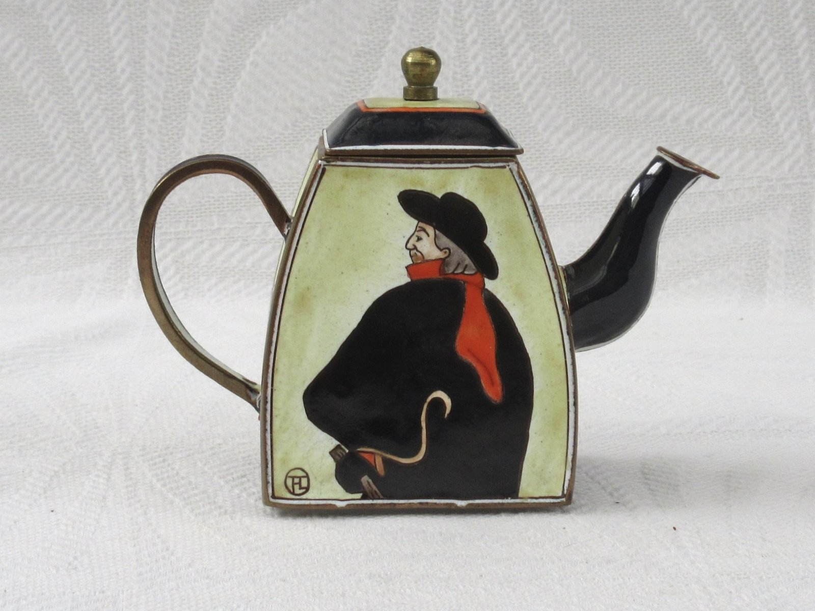 Vintage Kelvin Chen Miniature Enamel Teapot Lautrec Swordsman. Lovely decorative design, perfect for cabinet curiosities.