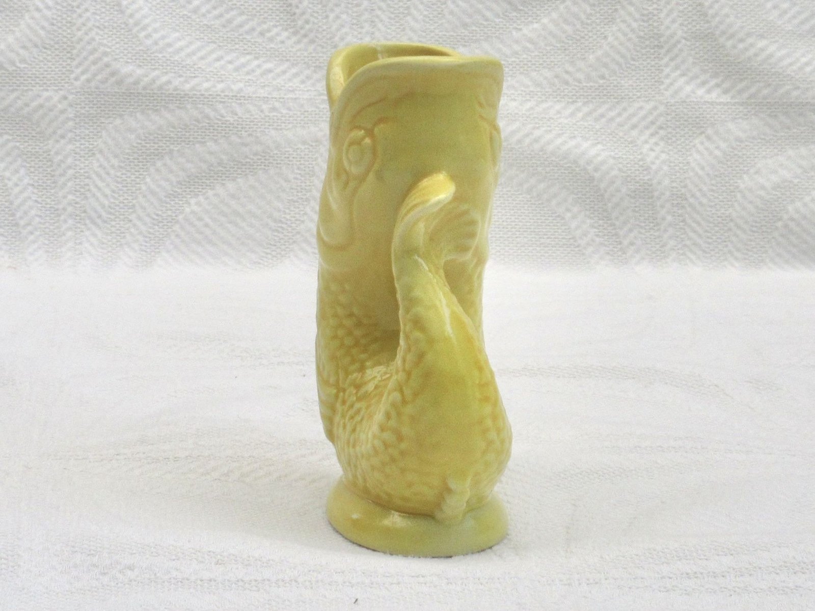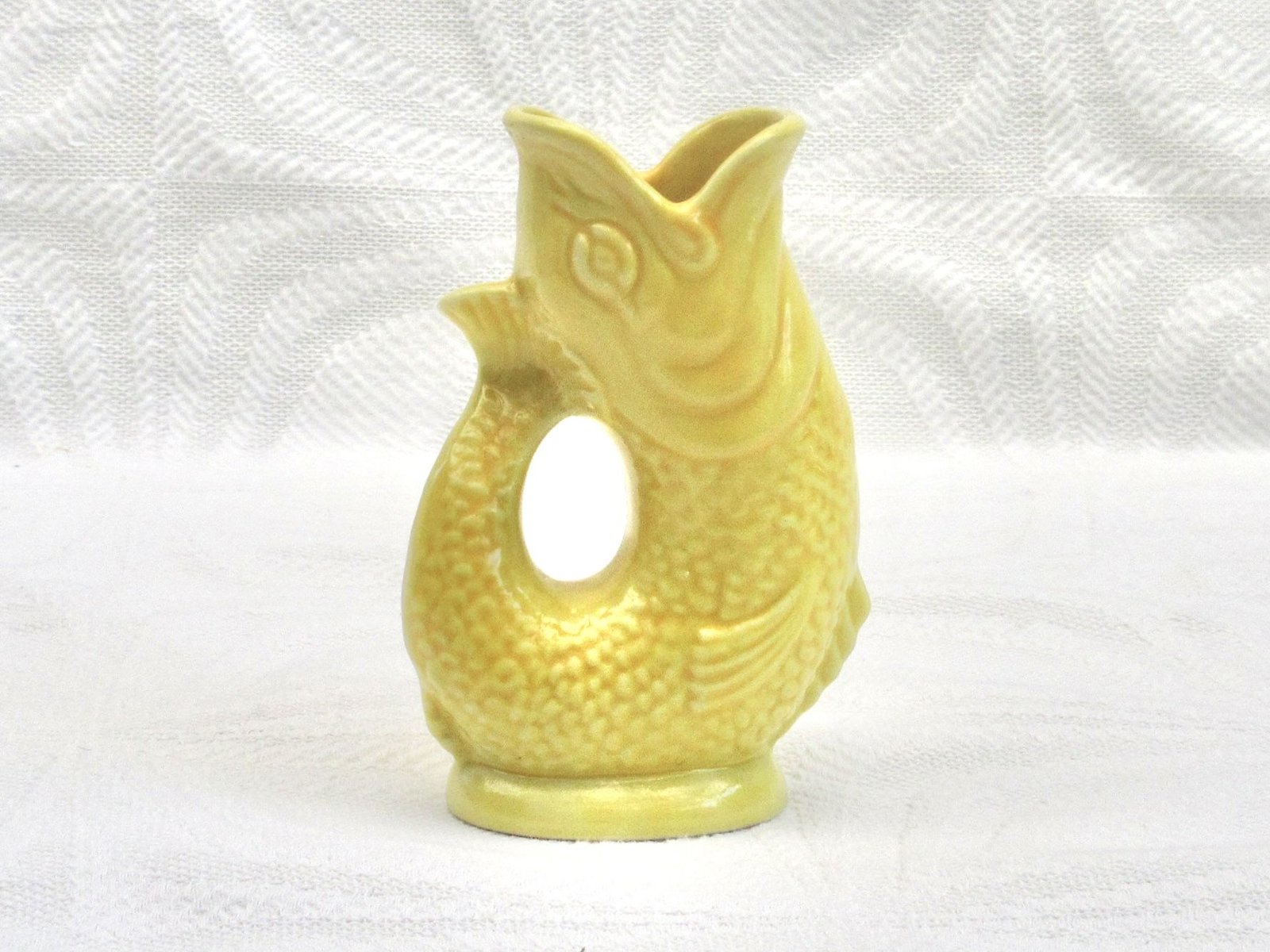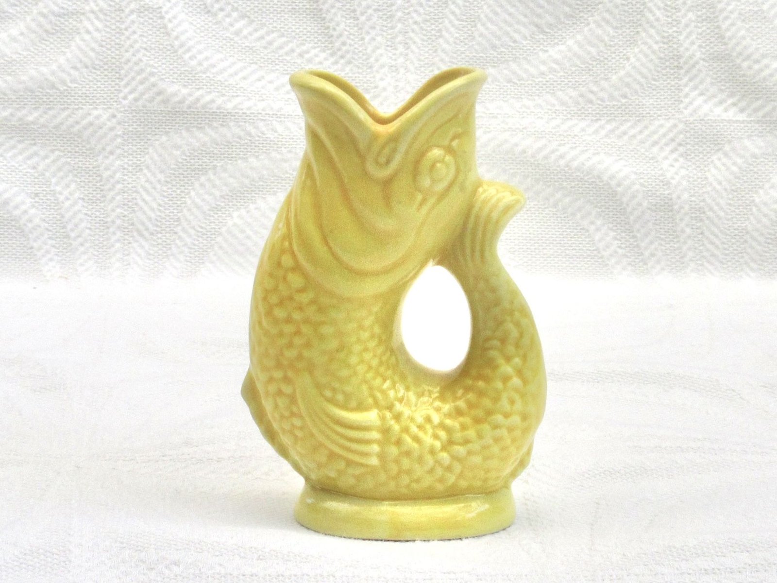 Vintage Wade Fish Gluggle Jug Yellow Small 3 1/2 Inch. This does have some age to it although I’m not sure when it was manufactured. It has a WADE ENG mark on the base which is different to the modern manufacture ones. Lovely yellow colour and very attractive piece.